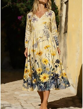 Per donna Abito Midi Abito Boho Vestito Casual Elegante Vintage Quotidiano All'aperto Vacanza Vestibilità regolare Floreale Manica Lunga Scollo a V Giallo Estate Primavera Autunno