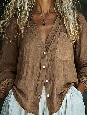 Camicia da donna 100% cotone con bottoni, tinta unita, moderna, maniche lunghe, scollo a V, modello regolare, bianca, ideale per tutti i giorni, per l'estate.
