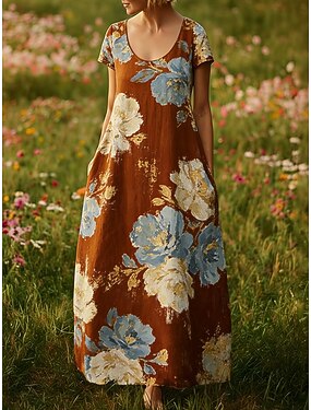 Per donna Abito Midi Finto cotone e lino Vestito a caftano Vestito Casual Abito Largo Moda Moderno Casual Quotidiano All'aperto Spiaggia Vestibilità comoda Semplice Manica Corta Girocollo Blu Nero