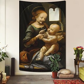 Vergine Maria rinascimentale Bambino Gesù Benois Leonardo da Vinci arte religiosa cristiana arazzo da parete piccoli fiori bianchi aureole da appendere per soggiorno camera da letto decorazione per la