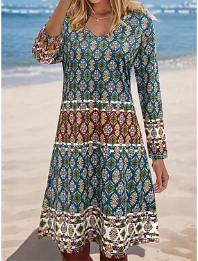 Per donna Mini Abito Vestito Casual Vestito Estivo Abito a trapezio Bohemien Vintage Elegante Spiaggia Vestibilità regolare Grafico Geometrico Astratto Manica Lunga Scollo a V Verde Estate Primavera
