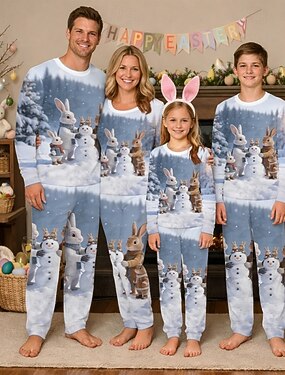 Famiglia Pasqua Pigiama Grafico Coniglietto Casuale Stampato Blu Manica Lunga Vacanza Abiti coordinati