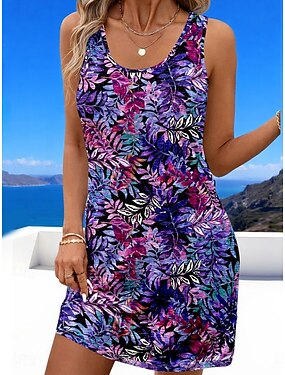 Per donna Mini Abito Vestito Estivo Abito a trapezio Abito Estivo Vacanza Casual Boho Spiaggia Feste Matrimonio Vestibilità regolare Floreale Grafico Senza Maniche Collo a U Blu Rosa Viola Arancione