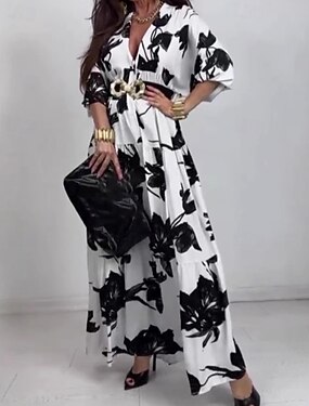 Per donna Abito Midi Abito Stampato Moda Moderno All'aperto Vacanza Ferie Vestibilità regolare Fiore Manica 3/4 Scollo a V Bianco e nero Autunno