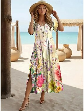 Per donna Abito lungo maxi Vestito Casual Abito Boho Vintage Quotidiano All'aperto Spiaggia Vestibilità regolare Floreale Manica Corta Collo a U Giallo Estate Primavera