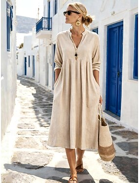vestito midi da donna in cotone e lino, modello a trapezio, casual, quotidiano, vestibilità ampia, tinta unita, manica a 3/4, scollo a V, albicocca, estate e primavera