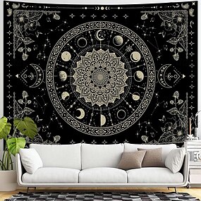 arazzo con fasi lunari in bianco e nero, mandala celeste, arazzo da parete, cielo notturno stellato, arte floreale botanica, grande arazzo tessile, arredamento per la casa, sfondo, poster in tessuto.