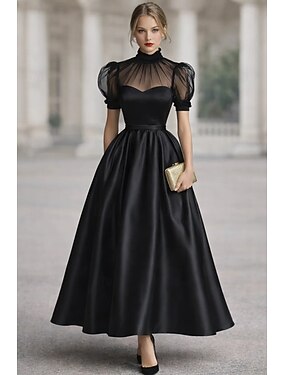 Linea ad A Lunghezza alla caviglia Abiti da Cocktail Elegante Vintage Abiti semi formali Manica Corta Collo Alto Festa in giardino Matrimonio Tasca Raso Tulle con Pieghe