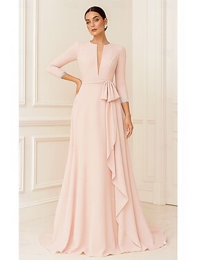 Linea ad A Lunghezza al pavimento Abito da Sera Elegante Manica 3/4 Scollo a V Matrimonio Formale Crepe Elasticizzato con Volant