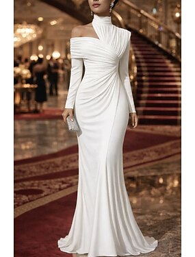 Sirena Tromba Lunghezza al pavimento Abito da Sera Elegante Abito da sera stile impero Manica Lunga Collo Alto Festa serale Matrimonio Raso Elasticizzato con Pieghe Tinta unita