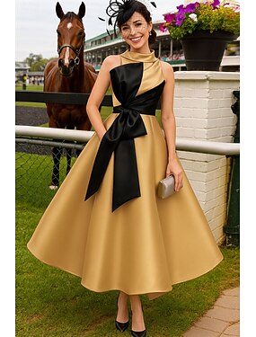 Linea ad A Lunghezza alla caviglia Abito Derby Abito da cerimonia per signora Senza Maniche Girocollo Collo Alto Elegante Derby del Kentucky Raso con Fiocco/Fiocchi Blocco di Colore