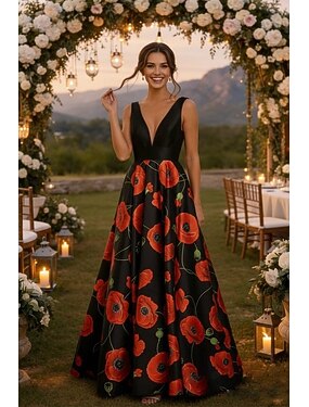 Linea ad A Lunghezza alla caviglia Abiti da Cocktail Abiti da festa Elegante Floreale Senza Maniche Scollo a V Matrimonio Formale Raso con Ricamo Tasca