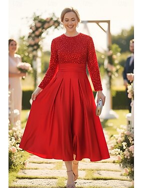 Linea ad A Abito Lunghezza Tè Perline ricamate Abito Formale Abito da madre della sposa Abiti da Cocktail Abiti da festa Elegante Vintage Mezza Manica Colletto a Camicia Formale Ospite di nozze Raso