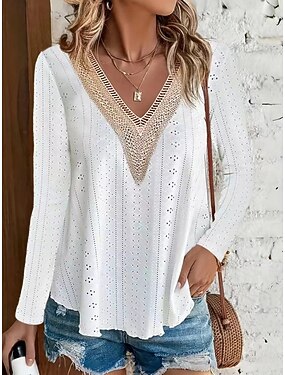 Per donna Maglietta Top in pizzo Pizzo Traforato Stampato Tinta unica Moda Classico Casual Manica Lunga Scollo a V Top Regolari Quotidiano Uscire Weekend Nero Bianco Giallo Rosa Rosso rosa Primavera