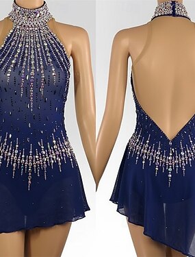 abito da pattinaggio artistico, abito da pattinaggio sul ghiaccio da donna e da ragazza, blu navy, schiena scoperta, orlo asimmetrico, maglia ad alta elasticità, abbigliamento da pattinaggio per