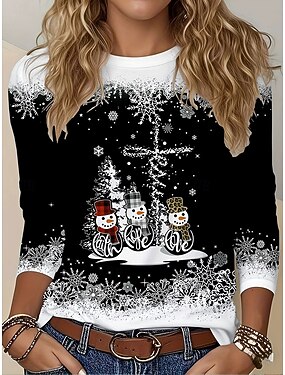 Maglietta a maniche lunghe da donna per Natale con grafiche di pupazzi di neve moda vintage stile elegante girocollo top regolari stampa quotidiana per il weekend rossa blu viola oro verde estate