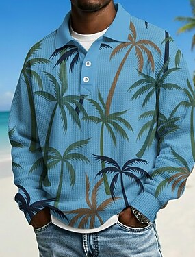 Per uomo Palma Magliette Polo a Nido d'Ape Manica Lunga Magliette polo Bavero Hawaiano Athleisure Abbigliamento quotidiano Abbigliamento da vacanza Stampa 3D Primavera Autunno Inverno Blu Bianco
