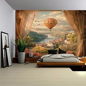 Arazzo moderno con lago, acqua, foresta, cascata, barca, stampa digitale, paesaggio da appendere alla parete per camera da letto, soggiorno, dormitorio, decorazione per la casa, sfondo fotografico