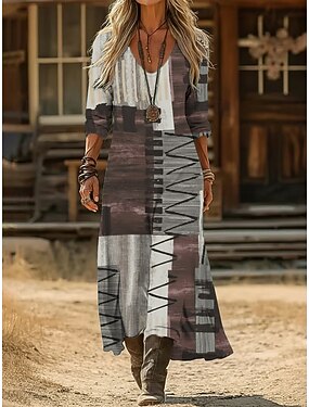 Per donna Abito lungo maxi Abito Vintage Vestito Casual Vintage Quotidiano All'aperto Vacanza Vestibilità regolare Geometrico Manica Lunga Scollo a V Grigio Primavera Autunno