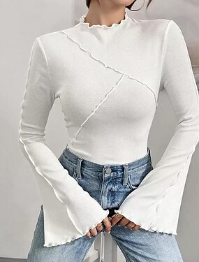 Per donna Top a maglia a coste Maglietta Top aderente Volant Cuciture a vista Tinta unica Elegante Manica Lunga Manica a campana Collo alto Top Regolari Uscire Weekend Bianco Primavera Autunno