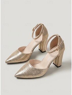 Décolleté da donna con tacco a blocco metallizzato color oro, punta affusolata e cinturino alla caviglia, eleganti scarpe da cerimonia per invitate a matrimoni e matrimoni in giardino. &eventi formali