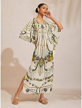 abito lungo in chiffon svolazzante con maniche a pipistrello e gioielli vintage