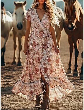 Per donna Vestito maxi Abito casual Abito Boho a maniche lunghe Abito boho Boemia Moda Essenziale Da mare Informale Giornaliero Standard Pop art Manica a 3/4 A V Marrone rossastro Blu Estate