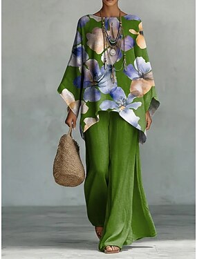 Per donna Camicia Set di biancheria in cotone Set di Pantaloni Manica Lunga Manica a Campana Girocollo Floreale Grafico Stampato Vacanza Moda Streetwear Casuale Quotidiano All'aperto Blu Blu marino