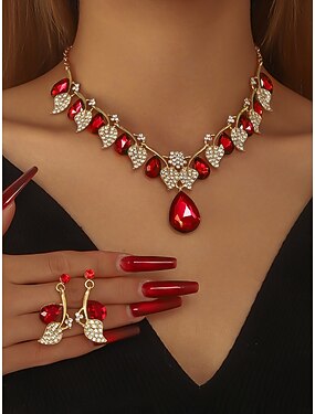 foglia d'oro da donna &set di gioielli in cristallo rosso: collana delicata, orecchini pendenti &bracciale coordinato, accessori floreali romantici per feste, matrimoni &eventi speciali