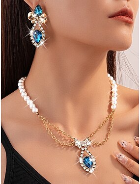 perla da donna &set di gioielli in cristallo blu: elegante collana e orecchini pendenti con dettaglio fiocco per feste, eventi serali &occasioni speciali