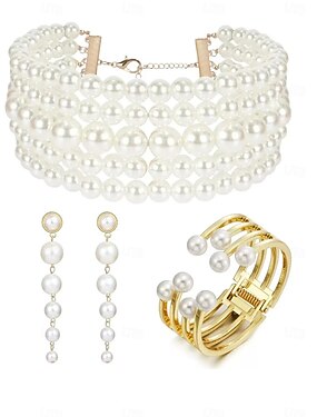 set di gioielli da donna in oro e perle per feste: collana a catena spessa, orecchini vistosi, bracciale e anello, eleganti accessori in stile barocco per la sera &eventi formali