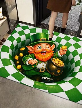 Tappeto con illusione ottica 3D per San Patrizio, zerbino con stampa piatta 2D raffigurante un allegro folletto con motivo a vortice a scacchi verdi e bianchi, perfetto per l'ingresso di casa in stile