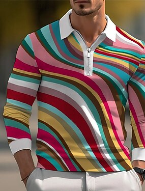 Per uomo Blocco di colori Geometrico Polo Manica Lunga Collo ripiegato Casual Sport & Outdoor Athleisure Casual Quotidiano Cerniera Stampa 3D Primavera Autunno Inverno Arcobaleno