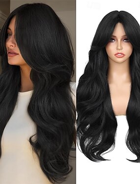 parrucca lunga ondulata da 26 pollici con frangia a tendina e attaccatura realistica, parrucca sintetica lunga nera con frangia, parrucche ondulate naturali per donne di colore, uso quotidiano per