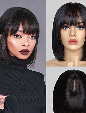 parrucca bob corta con frangia, parrucche bob in pizzo senza colla, capelli umani, parrucca bob 2x1 con frangia, capelli umani per donna, nero naturale, densità 180%