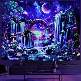 Arazzo fantasy con foresta in luce nera, arazzo con cascata al neon, arazzo con galassia spaziale reattivo ai raggi UV, arazzo con piante floreali colorate, arazzo da parete, sfondo per decorazioni