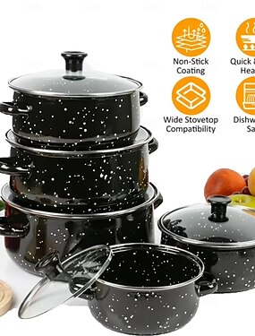 Set di 5 pentole smaltate, set di padelle con coperchio, pentola in ceramica, pentola per stufati a fondo piatto per zuppe e conserve