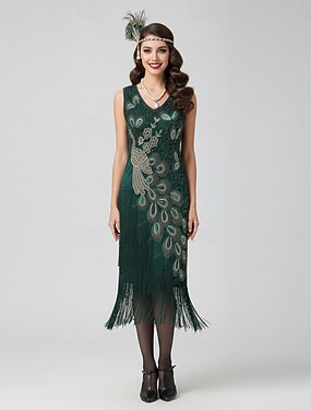 Set Anni Ruggenti Anni 1920 Lunghezza al ginocchio Vestito Abito Flapper Abiti con accessori Senza maniche Il grande Gatsby Charleston Invitato al matrimonio Paillettes Frangia con nappe Piuma Scollo