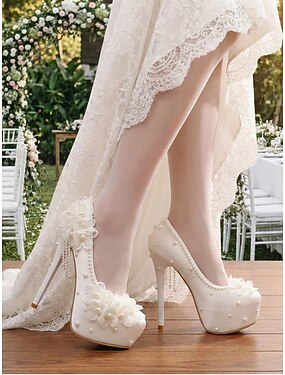 eleganti scarpe da sposa con tacco alto in pizzo bianco perla – scarpe da sposa con plateau e applicazioni floreali per cerimonie da ballo al coperto e in giardino