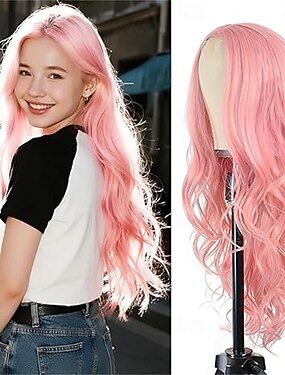 parrucca rosa per donna, parrucca sintetica ondulata lunga 26 pollici con riga centrale, parrucca di capelli resistenti al calore dall'aspetto naturale, per uso quotidiano, feste in cosplay &Halloween