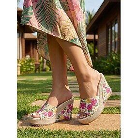 Sandali con zeppa romantici blu a fantasia floreale da donna - comodi sandali espadrillas con plateau e fiocco, ideali per resort all'aperto e vacanze al mare. &feste estive in giardino