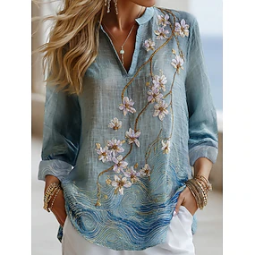 Per donna Camicia Finto cotone e lino Bottoni Stampato Floreale Quotidiano Casual Manica Lunga Scollo a V Top Regolari Quotidiano Ferie Blu Primavera Autunno