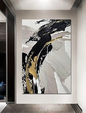 Dipinto a olio fatto a mano su tela, decorazione da parete, semplice, astratto, in bianco e nero, con applicazione di lamina d'oro per la decorazione della casa, dipinto appeso su telaio teso/dipinto