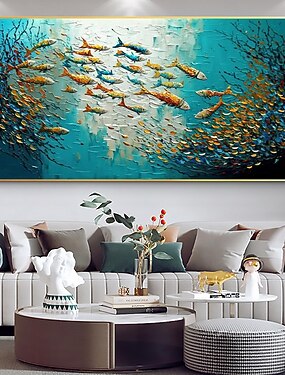 dipinto a olio originale fatto a mano della scuola di pesci colorati su tela arte murale astratta del mondo sottomarino per l'arredamento della casa con cornice tesa senza cornice interna