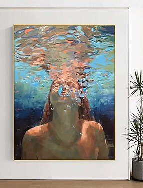 pittura a olio subacquea, pittura murale subacquea, ragazza che nuota, dipinto astratto blu, immersioni nell'oceano, donna sensuale che nuota, tela dipinta a mano, arte murale