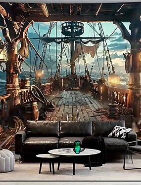 nave pirata avventura nautica ponte di nave in legno onde dell'oceano vista del mare lanterne tramonto arazzo da parete sfondo da appendere per soggiorno camera da letto tana dell'uomo festa a tema