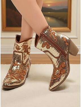stivaletti western da donna con paillettes dorate e ricami floreali: comodi tacchi a blocco per feste serali, festival e uso quotidiano