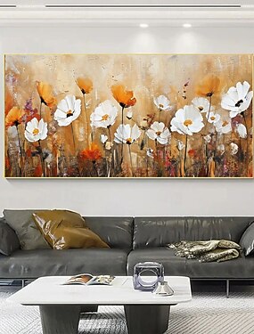 dipinto a olio su tela con fiori dorati, fatto a mano, arte murale, dipinto floreale bianco astratto, arredamento per soggiorno, arredamento per la casa, dipinto arrotolato senza cornice e non