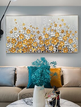 Dipinto a olio fatto a mano su tela, decorazione da parete, astratto, foglie dorate, grandi fiori bianchi per la decorazione della casa, dipinto appeso su telaio teso/dipinto arrotolato senza cornice
