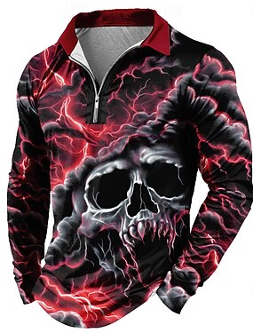 Giorno dei Morti Per uomo Teschio Polo Manica Lunga Magliette polo Bavero Casual Scuro Abbigliamento quotidiano Abito da festa Stampa 3D Polo con cerniera a un quarto Primavera Autunno Inverno Rosso